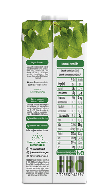 Productos Bebidas Coco sin azúcar 946ml Coco sin azúcar 946ml Bebida de coco sin azúcar añadida, una opción refrescante y baja en calorías. Beneficios: Baja en Sodio Menos de 35kcal por porción de 200ml Libre de gluten Libre de carragenina Non GMO Sin azúcar Sin colesterol Vegano Fácil digestión Modo de uso: Café/Té Smoothies Alimentos Ingredientes Agua, Crema de Coco (Extracto de coco, Agua, Estabilizantes (Goma Xantana y Goma Guar)), Carbonato de Calcio (Fuente de Calcio), Saborizantes naturales, Estabilizantes (Goma Xantana y Goma Gellan), Sal, Vitamina A y Vitamina D. Baja en Sodio Menos de 35kcal por porción de 200ml Sin colesterol Fácil digestión Ingredientes Agua, Crema de Coco (Extracto de coco, Agua, Estabilizantes (Goma Xantana y Goma Guar)), Carbonato de Calcio (Fuente de Calcio), Saborizantes naturales, Estabilizantes (Goma Xantana y Goma Gellan), Sal, Vitamina A y Vitamina D. Baja en Sodio Menos de 35kcal por porción de 200ml Sin colesterol Fácil digestión Suscríbete PARA RECIBIR NOTICIAS QUE TE AYUDARÁN A TRANSFORMAR TU DÍA. Conoce cómo sentir lo bueno de cada día antes que nadie acompañado de nuestra variedad de productos y deliciosas recetas. Nombre(s) completo Correo electrónico Acepto recibir información y comunicación de Terrafertil y sus marcas a través de diversos medios de comunicación. Al registrarme, confirmo ser mayor de edad y acepto el Aviso de privacidad del presente sitio.* Suscribirme Te invitamos a descubrir... Bebidas Coco sin azúcar 946ml
